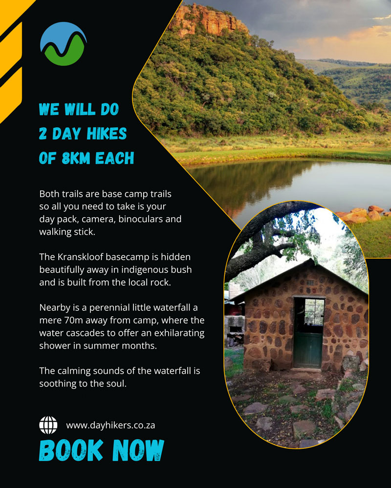 The Kranskloof basecamp is hidden beautifully away in indigenous bush and is built from the local rock. Nearby is a perennial little waterfall a mere 70m away from camp, where the water cascades to offer an exhilarating shower in summer months. The calming sounds of the waterfall is soothing to the soul. Well behaved dogs are welcome but please be aware that this is a nature reserve and there are things out there that can be hurt and can hurt your animals.